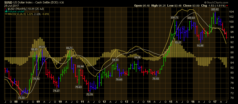 בגרף בטווח של 10 שנים ניתן לראות לאיזה רמות שיא הגיע השער ומה המגמה כעת. מתנד ה-MACD מציין שהגרף כעת בגלים יורדים. רואים גם שמעל שער 100 נק' יש התנגדות שלא איפשרה צמיחה נוספת. בטווח ארוך מהנצפה בגרף המגמה עדיין שורית ורק עם ירידה משער 92 נק' המגמה הראשית היומית תתהפך לדובית.