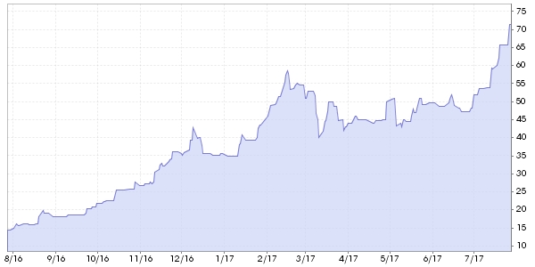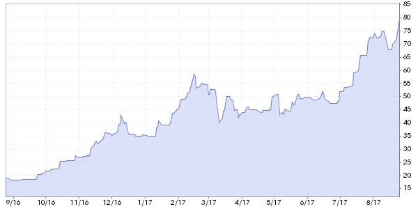 גרף המניה שורי עם צמיחה שנתית של למעלה מ-400%. הגרף שורי גם עלפי מתנדי ה-MACD ה-RSI והממוצעים הנעים 20 ו-50.