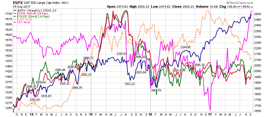 בגרף החמש השנים האחרונות ובעמודה שבועית, המטבע הסיני והמדד האמריקאי בנסיקה, המדדים התל אביביים בדישדוש והדולר בצלילה.
