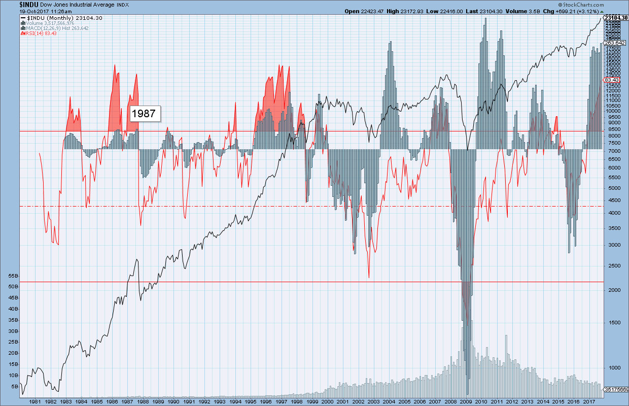להלן גרף חודשי עבור 40 שנים למדד הדאו תוך ציון שנת 1987.