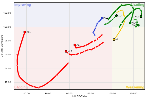 כשהסקטורים המובילים בצמיחה בצבע ירוק הם XLK טכנולוגיה ו- XLV בריאות