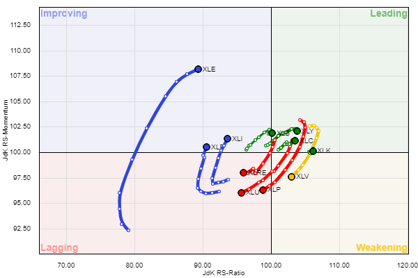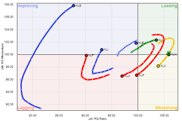 בגרף התנועה היחסית לגרף ה-S & P של הקרנות המרכזיות נראה בטווח החודשיים וחצי האחרונים בהובלה מצד תעודות הטכנולוגיה, המוצרים והשירותים, כמו הצמיחה באנרגיה, דישדוש בחומרים והשקיעה בתחומי התעשיה כפי שמראה הגרף באדום. הזנב של כל סקטור מראה את העוצמה.