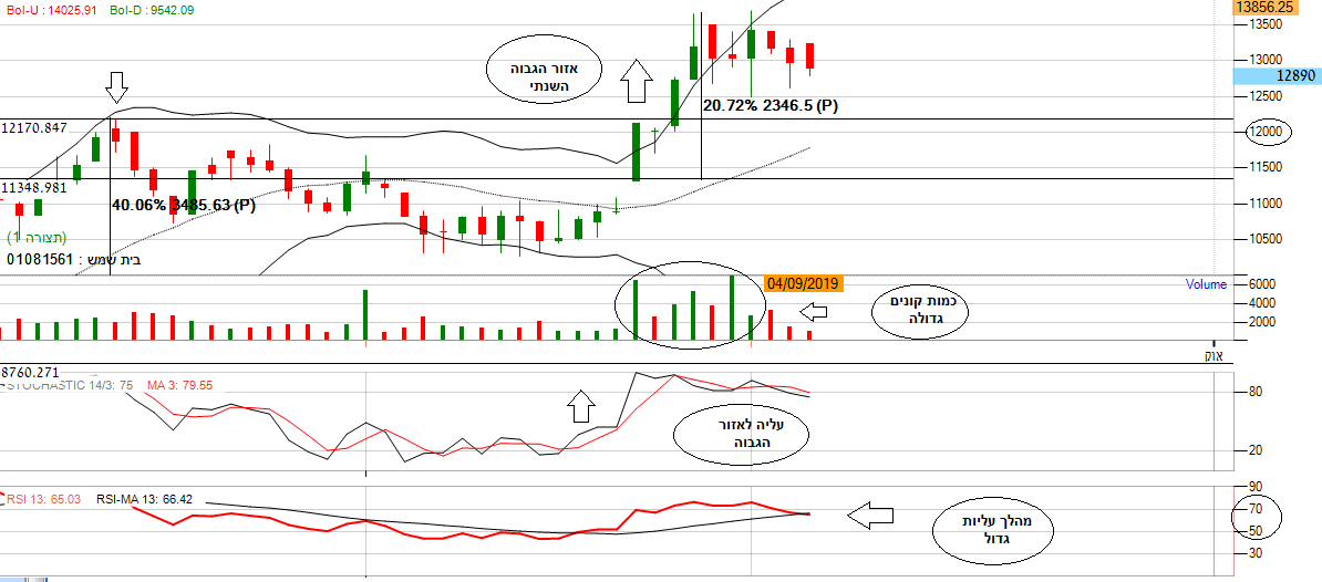 על פי הגרף החודשי ניתן לראות שהמניה עלתה קרוב ל 40% מסוף חודש יוני והגיעה לשער 12,200. אם נסתכל על מחזורי המסחר נוכל לראות עמודות ירוקות ארוכות הרבות יותר מהעמודות האדומות, מה שמייצג כמות קונים הגוברת על כמות המוכרים המראה לנו על מגמה חיובית.