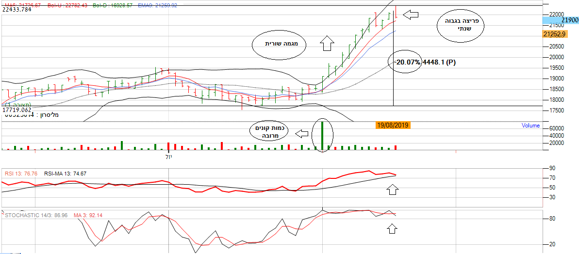 נקודה נוספת חיובית היא שרצועת בולינגר מראה גרף היוצא מאזור הרצועה העליונה וממשיך בעליה עד לשער 22400.