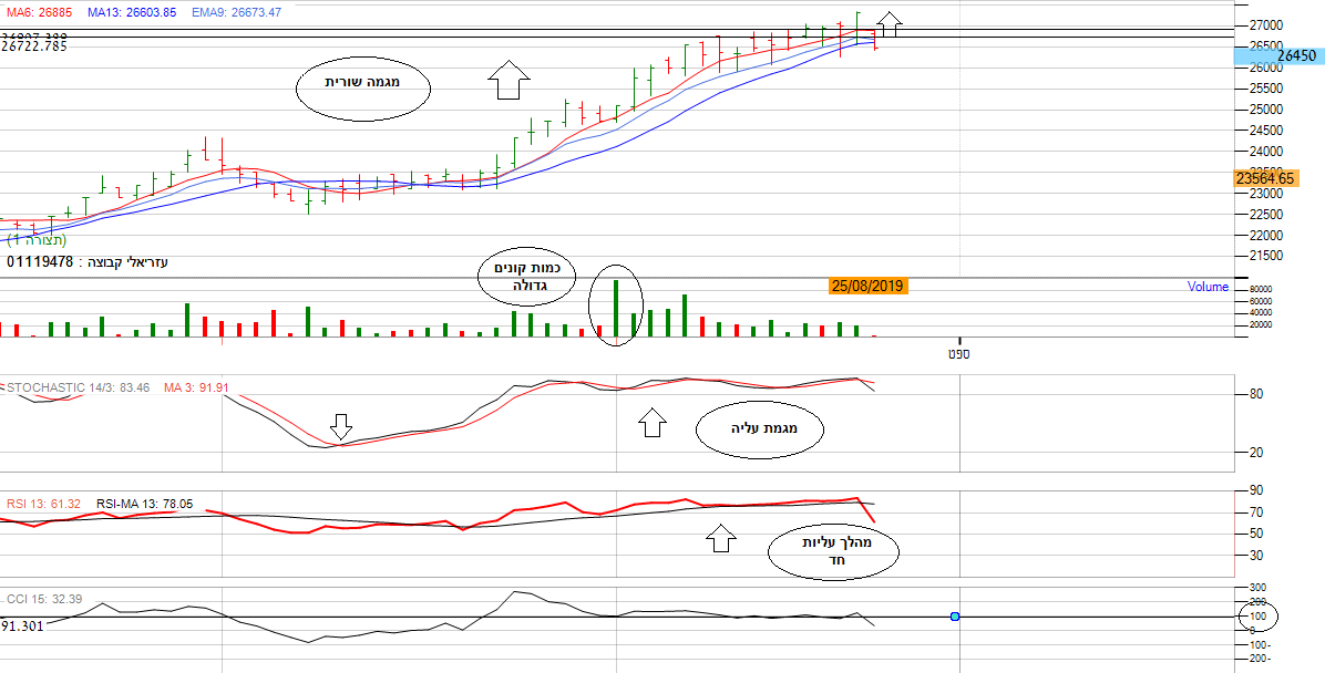הגרף הראשי מראה מגמה שורית. ניתן לראות זאת על פי הממוצעים הנעים המסודרים בסדר עולה. ניתן להעריך צמיחה על פי גרף העמודות בכיוון 27,500 ₪.