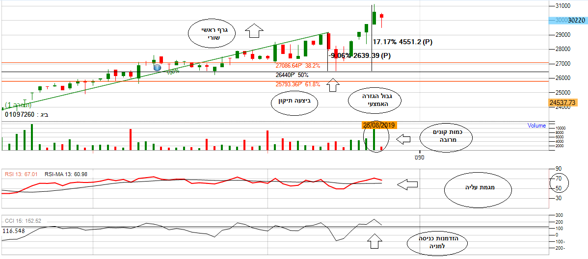 על פי חיתוכי פיבונאצי נראה שגרף המניה ירד אל איזור גבול הגזרה האמצעי והמשיך אל מעל לרצועה העליונה ואף עלה קרוב ל- 17% לאיזור שער 31100. על פי מחזורי המסחר ניתן לראות עמודה ירוקה ארוכה המייצגת כמות קונים מרובה.