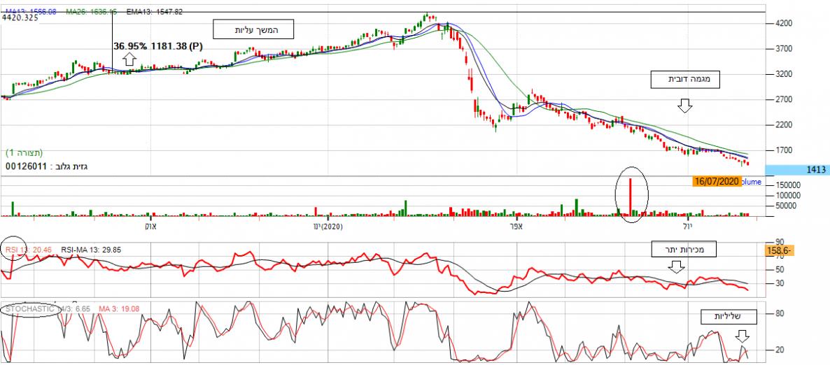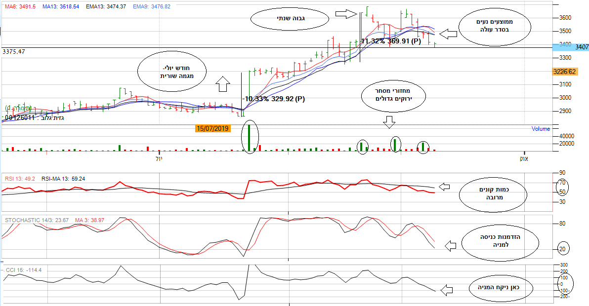 בניתוח גרף העמודות ניתן לראות שבחודש יולי המניה פתחה במגמה שורית. בסוף החודש נראתה פריצה בגבוה שנתי ועליה של כ- 10% ביומיים. בנוסף, ניתן לראות שהממוצעים הנעים מסודרים בסדר עולה ומראים המשך עלייה בטווח המיידי.
