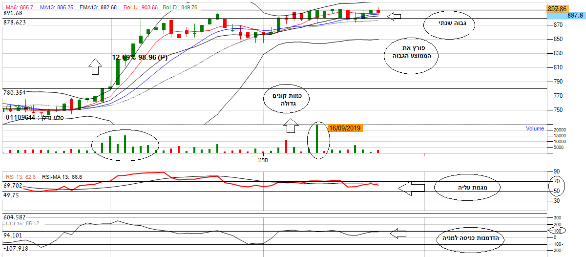 בנוסף לפרמטרים החיוביים אנו נראה שמתנד ה- RSI נע בין 50-70 נק' המייצג מגמת עליה. יתרה מכך מתנד ה- CCI מראה הזדמנות כניסה למניה בכך שנע באיזור ה- 100 נק.