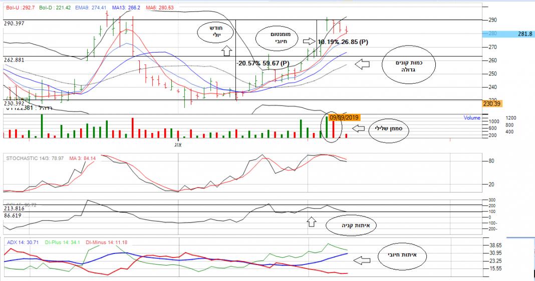 המניה נעה ב 3 חודשים האחרונים בתנודתיות גבוהה מאוד ונשאלת השאלה האם המניה חיובית או שלילית? אם נסתכל על הממוצעים הנעים אנו נראה שהם מראים היפוך מגמה בכך שלאחר מספר ניסיונות עליה הממוצעים יורדים לאזור 240, מה שמייצג מגמה שלילית.