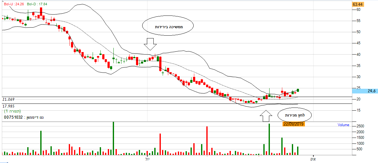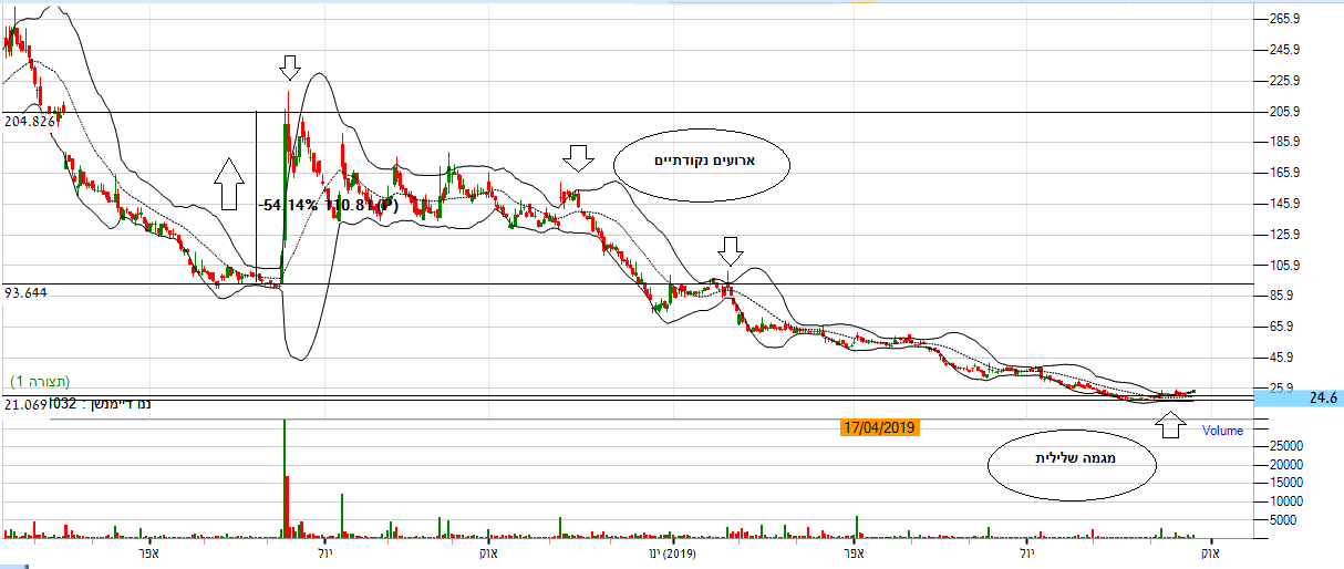 המגמה בגרף הראשי דובי. למרות העליה המטורפת שעשתה המניה בשנה הקודמת שעלתה קרוב ל 55% ביומיים, זו ביצעה היפוך מגמה למגמה שלילית בכך שירידה לנמוך השנתי שהינו 18 , מה שמסמל על מגמה שלילית שלא רואים את סיומה. בנוסף על פי גרף הנרות אנו נראה שהמניה נעה לפי אירועים נקודתיים שבהם המניה עולה בקיצוניות וממשיכה לירידות.