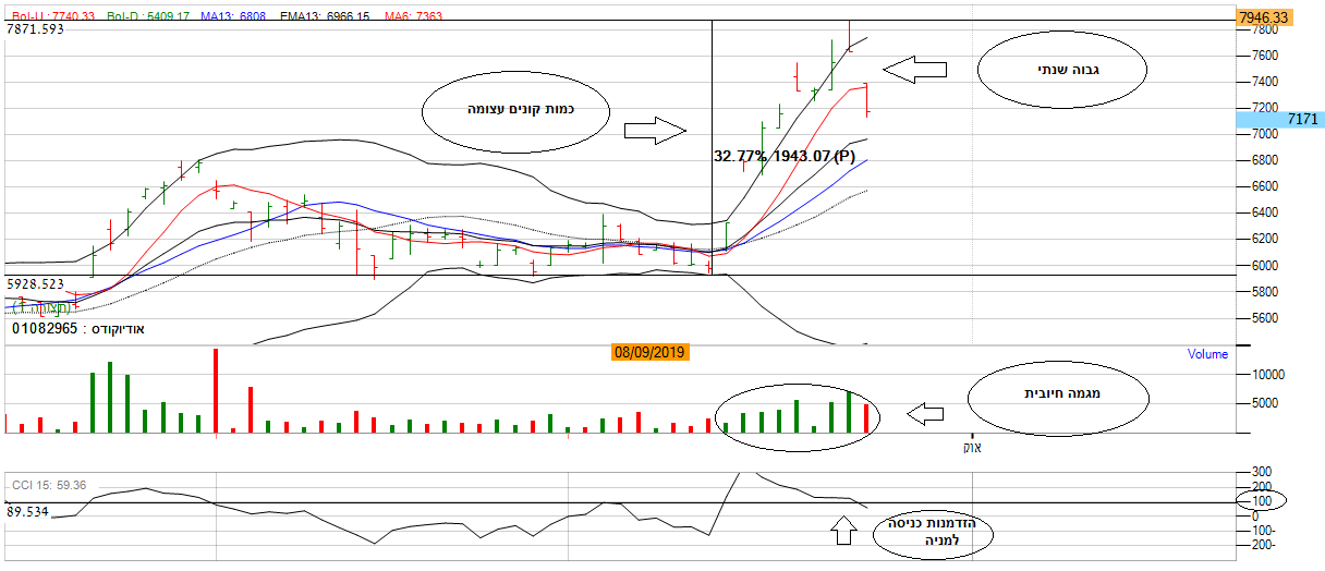 בנוסף לפרמטרים החיוביים המניה פורצת מתוך רצועת הבולינגר לגבוה השנתי לשער 7750. מה שמייצג המון קונים במניה. המומנטום בגרף החודשי עדיין חיובי כאשר הממוצעים הנעים מסודרים בסדר עולה