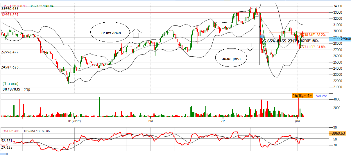 על פי חיתוכי פיבונאצי למרות ניסיון העלייה בתחילת חודש ספטמבר, המניה המשיכה בירידות אל מתחת לגבול התחתון של פיבונצי אל שער 27000. מה שמלמד על המשך ירידה בטווח המיידי וגלי מוכרים לא מבוטלים.