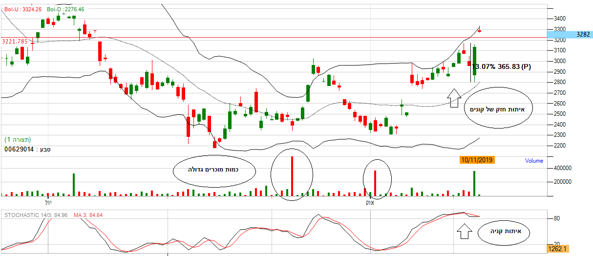למרות הפרמטרים השליליים על פי רצועת בולינגר בגרף החודשי המניה נעה בין הרצועה העליונה לתחתונה ואף יצאה מתוך הרצועה העליונה, מה שמשדר עוצמה ואיתות חזק של קונים שמזניק את המניה למעלה.