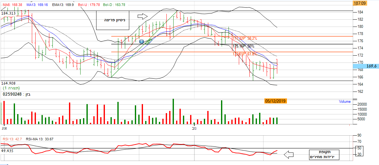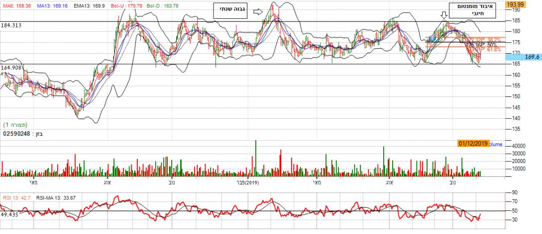 בניתוח גרף העמודות ניתן לראות שבחודש אוקטובר המניה ביצעה ניסיון עליה לאזור הגבוה השנתי. לאחר שלא הצליחה לפרוץ זו שינתה את כיוונה וירידה מתחת לקו ההתנגדות לשער 165. מה שמסמל על איבוד המומנטום החיובי במניה.