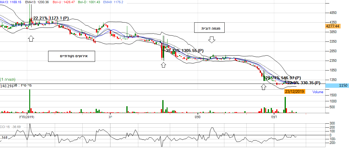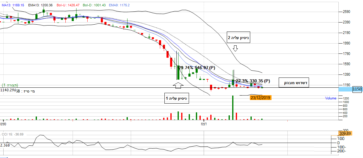 אם נתבונן על הגרף החודשי אנו נראה על פי רצועת בולינגר שלאחר ניסיון עליה בסוף חודש נובמבר של כ- 30% מעל הרצועה עליונה ללא הצלחה, זו שינתה את כיוונה לדשדוש סביב השער 1150. בנוסף בתחילת חודש דצמבר למרות ניסיון עליה נוסף של המניה שהצליחה לעלות מעל לרצועה האמצעית עדיין המניה המשיכה לנוע באותו הכיוון. מה שמסמל על המשך דשדוש בטווח המיידי.