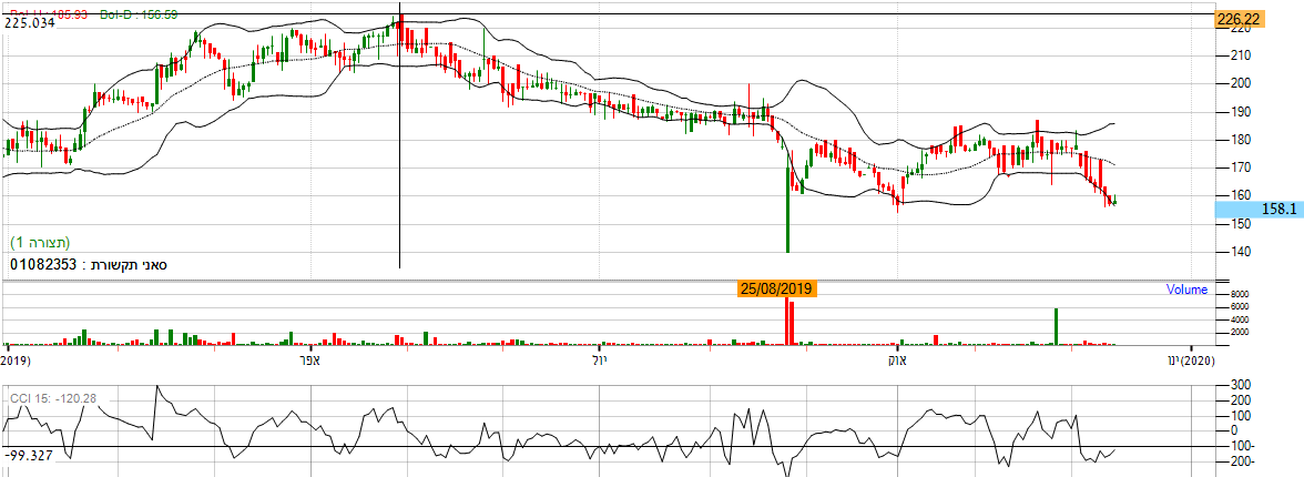- אחת המניות השליליות בשוק. בחרתי להראות גרף שנתי כדי לחזק את טענתי . לאחר שהמניה ביצעה את מהלך העליות שלו בסוף חודש אפריל זו שינתה את כיוונה ופתחה בירידות. אם נתבונן בטווח היומי אנו נראה שגרף המניה נע באזור הרצועה התחתונה ואף שובר אותה, מה שמסמל על המשך ירידות בטווח המיידי. אם נתבונן על מתנד ה CCI אנו נראה שגרף המחירים נע באזור ב 100- ל 200- מה שמסמל על מגמת ירידה. *אנו נמתין ולא נכנס למניה.