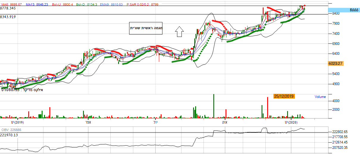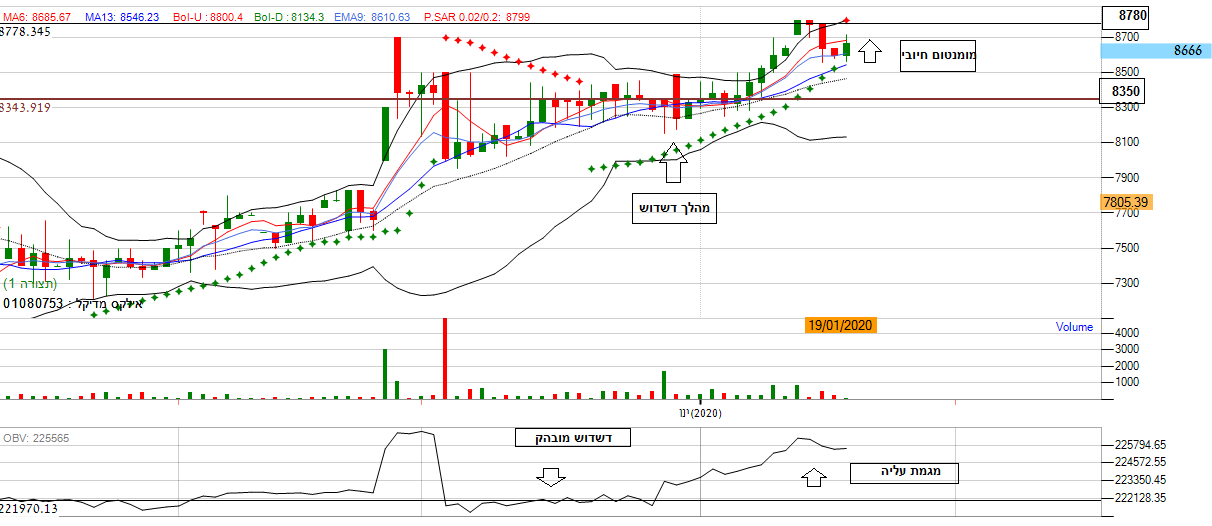 אם נתבונן על הגרף החודשי אנו נראה שהמניה סיימה את מהלך הדשדוש שבו היא שהתה. ניתן לראות זאת בסוף חודש דצמבר, המניה דשדשה סביב השער 8350 והמשיכה בעליות לאיזור הגבוהה השנתי שהינו 8780, מה שמייצג המשך מומנטום חיובי בטווח המיידי.