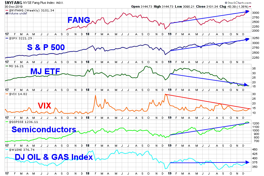 לסיכום שנת 2019 בחרתי להעלות השוואה של מעט גרפים מובילים ובהם - ה-FAANG מובילי הטכנולוגיה, ה-S&P, הקנביס, מדד הפחד VIX, השבבים והאנרגיה.