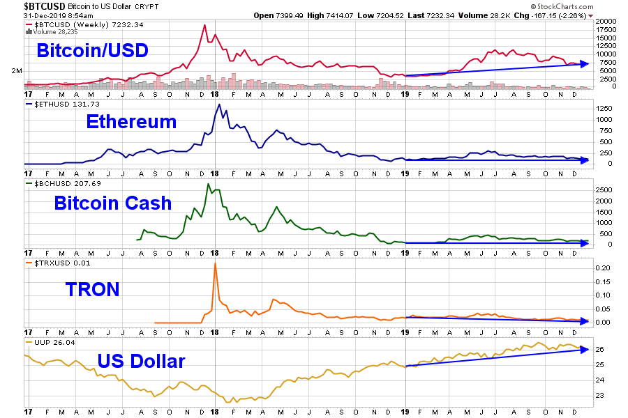 שנת 2019 - סיכום תנועת מספר מטבעות קריפטוגרפיים יחסית לדולר ארה"ב