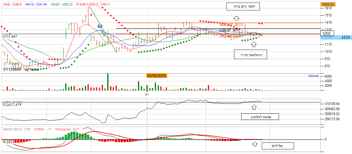 אחת המניות התנודתיות בשוק. בניתוח גרף העמודות אנו נראה שהמניה לא מראה מגמה ברורה של קניה/ מכירה.