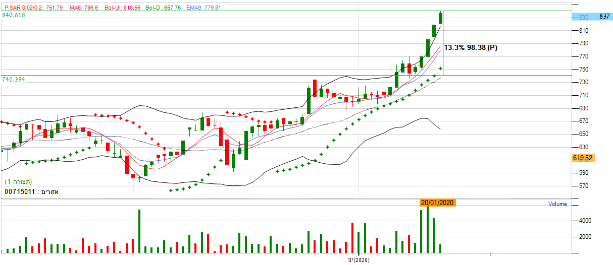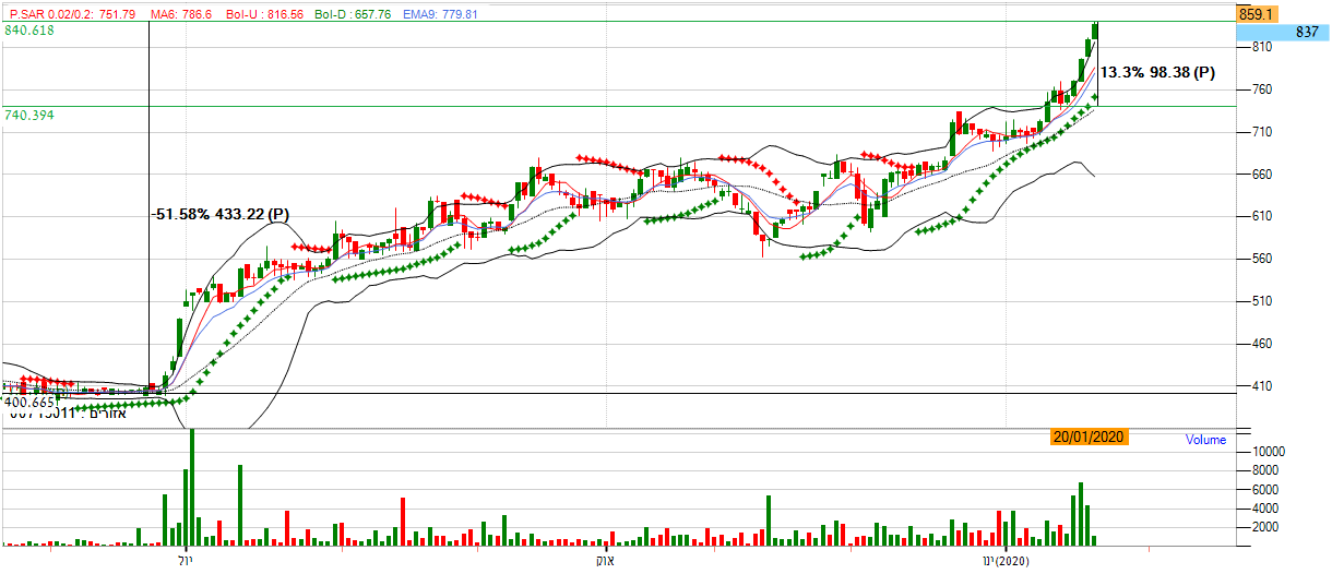 - הגרף מתחילת השנה הינו במגמה ראשית שורית. המניה עלתה קרוב ל 50% מתחילת השנה, מה שמייצג כי בכל קניה קיים רווח. אם נסתכל בגרף החודשי נראה שהמניה עלתה כ- 13% ב- 5 ימים ואף הגיעה לשער 840 - הגבוה השנתי. בנוסף על פי מחזורי המסחר אנו נראה שכמות הקונים גוברת על כמות המוכרים בכך שקיימות עמודות ירוקות ארוכות המסמלות על מגמה חיובית. המומנטום בגרף החודשי עדיין חיובי כאשר הממוצעים הנעים מסודרים בסדר עולה. בנוסף ניתן לראות שהמניה נעה בין הממוצע האמצעי לגבוה ברצועת בולינגר ואף פורצת ממנו, מה שמלמד על המשך עניין במניה. בנוסף לפרמטרים החיוביים אנו נראה שמתנד ה P.SAR מייצג מגמת עליה בכך שקיימות נקודות רבות מתחת לגרף המניה. *בטווח המיידי יתכן תיקון טכני קטן של 5% אבל זו בעיקר הזדמנות קניה.