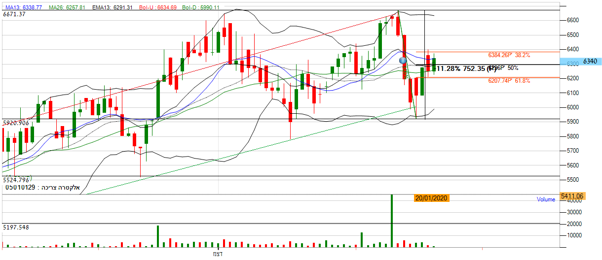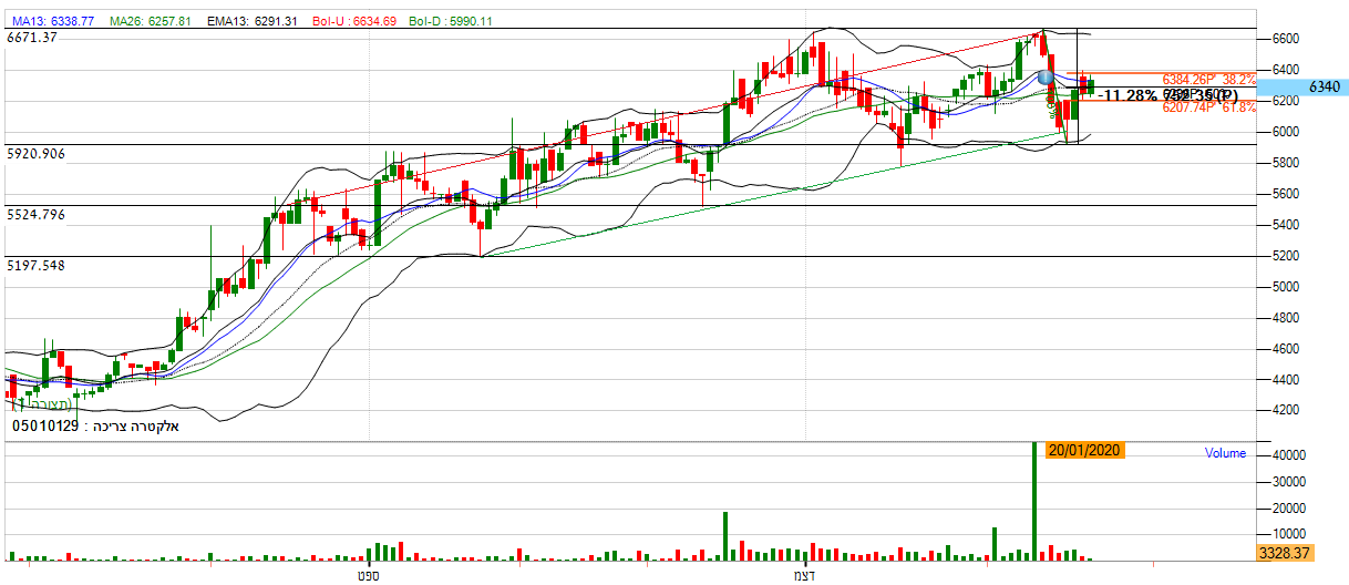 [2020-01-20 14:01:44] המנתחת: בטווח הקצר: אם נתבונן על הגרף החודשי אנו נראה מניה תנודתית למדי . על פי רצועת הבולינגר המניה ביצעה ניסיון עליה מעל לרצועה העליונה אך זו נעה באזור הרצועה האמצעית מה שמשדר היחלשות הנייר. בנוסף המניה ביצעה ירידה של 11% תוך 4 ימים, מה שמסמל על מומנטום שלילי. לאחרונה נראה התנגדות משמעותית משער 5533. אומנם התנועה נעה בתוך תעלה עולה והשערים סימנו שער יעד של 6670 אך זו עשתה תיקון שלילי כלפי מטה עד לשער 5900. העמודה נשענת כעת על רמת תמיכה של 5190. *בטווח הקצר אנו נמתין לתיקון ולא נכנס למניה.