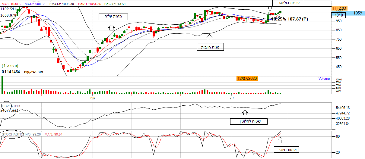כעת אנו נראה שהמניה ממשיכה להראות חיוביות בכך שהינה נעה באזור הרצועה העליונה של רצועת בולינגר ואף פורצת מתוכה, מה שמסמל על מגמה חיובית.