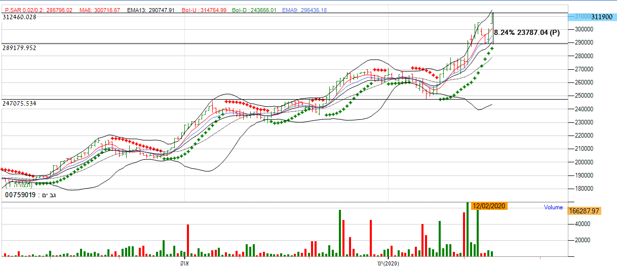 - לאחר שהחברה פרסמה דוחות על עליית הכנסות החברה ב 36% בשנת 2019 זו ממשיכה להראות מגמת עלייה. בניתוח שלי על המניה: המגמה בגרף הראשי שורית. על פי גרף העמודות המניה עלתה קרוב ל 8% ביומיים, מה שמייצג העיינות גדולה למניה. בנוסף על פי מחזורי המסחר אנו נראה שכמות הקונים גוברת על כמות המוכרים בכך שקיימות עמודות ירוקות ארוכות המסמלות על מגמה חיובית. בנוסף לפרמטרים החיוביים המניה פרצה את הרצועה העליונה של רצועת בולינגר ואף בטווח היומי עלתה לגבוהה השנתי שהינו 312100. מה שמייצג המון קונים במניה. המומנטום בגרף החודשי עדיין חיובי כאשר הממוצעים הנעים מסודרים בסדר עולה. יתרה מכך מתנד ה P.SAR ממשיך להראות מגמה עולה בכך שקיימות נקודות ירוקות רבות מתחת לגרף המניה. *יתכן תיקון טכני קל של 5% אך זו תהיה בעיקר הזדמנות קניה.