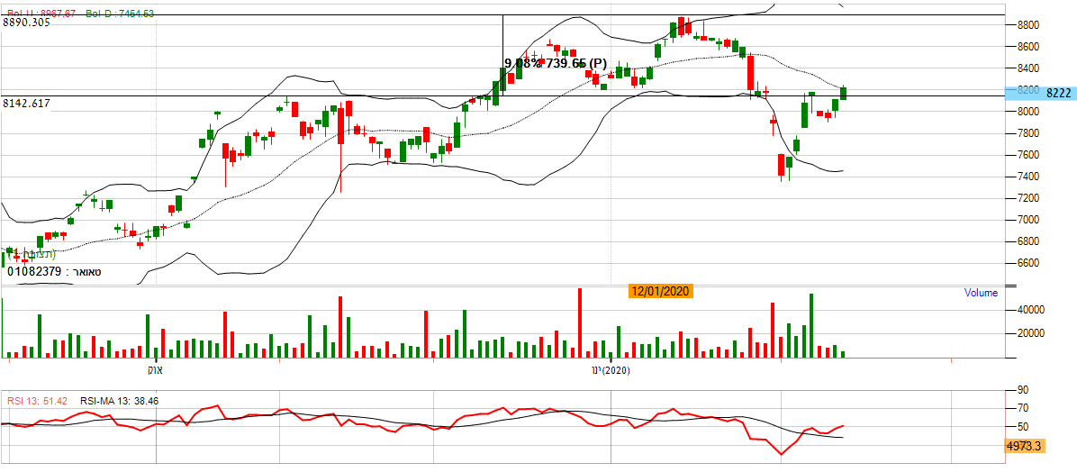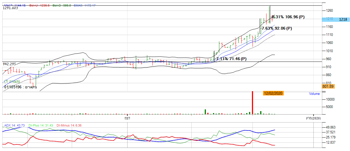 זו פתחה בעליות. בניתוח גרף העמודות ניתן לראות שבסוף חודש נובמבר המניה פתחה בדשדוש סביב השער 940 אך זו ביצעה שינוי מגמה בכך שעלתה כ- 7% ביום אחד בלבד בחודש ינואר. אם נתבונן על הגרף החודשי אנו נראה שהמניה נעה בין הרצועה העליונה לאמצעית של רצועת בולינגר, מה שמסמל על מניה חיובית. בנוסף בטווח היומי המניה פרצה את הרצועה העליונה ועלתה 8% לגבוה השנתי שהינו 1290, מה שמסמל העיינות גבוה למניה. בנוסף לפרמטרים החיוביים וכדי לחזק את הטענה, מתנד ה ADX מייצג איתות חיובי בכך שה DIP(הירוק) חוצה את DMI (האדום) כלפי מעלה. יתרה מכך, ה- DIP עולה מעל רף ה- 25 , מה שמסמל על מגמה שורית חזקה מאוד. למרות הפרמטר שלילי שהמחזורי המסחר מייצגים כמות מוכרים גדולה, אנו נכנס למניה. *גם כאן יתכן תיקון טכני קל של 5% אך זו בהחלט הזדמנות קניה.