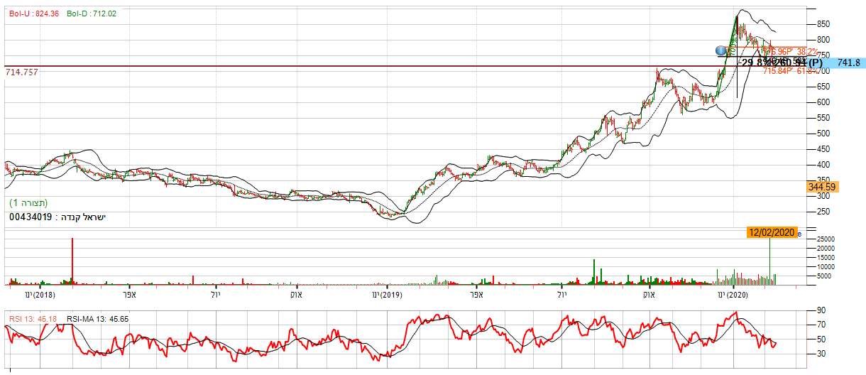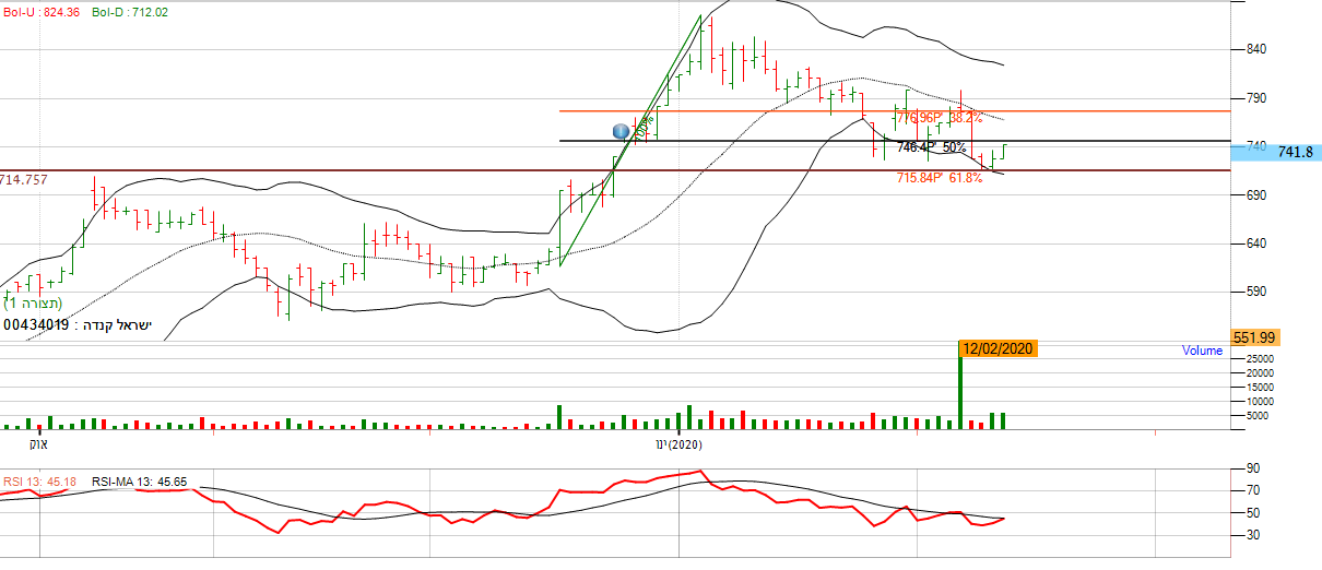 - החברה דיווחה שעסקת השליטה במלון פאבליקה בהרצליה בוטלה, מה שככל הנראה הוביל את המניה לירידות. בניתוח האחרון הערכתי שהמניה מייצגת מגמה חיובית. וכיום אם נתבונן על הגרף החודשי אנו נראה על פי חיתוכי פיבונאצ'י שלאחר שהמניה עלתה לגבוה השנתי זו פתחה בירידות וירדה לאזור קו התמיכה שהינו 720, מה שמסמל על מומנטום שלילי. בנוסף על פי מתנד ה RSI אנו נראה שגרף המחירים מייצג מכירות יתר בכך שנע בין 50- 30 נקודות. אך למרות הסממנים השליליים , המניה לא שברה את קו התמיכה ולא ירדה מתחת לגבול התחתון ואני מאמינה שהמניה תבצע תיקון ותמשיך בעליות. בשביל לחזק את הטענה, אנו נתבונן על מחזורי המסחר שמייצגים כמות קונים גדולה.