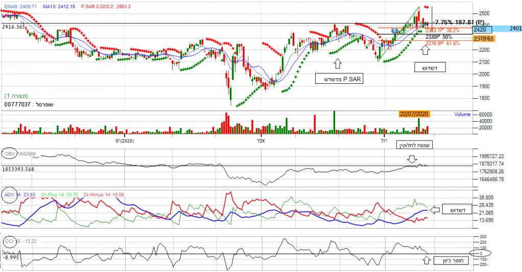 במבט ראשוני על המניה אנו נראה שהמניה מראה גרף ראשי שורי. אך אם נתבונן על הטווח היומי אנו נראה שמניה מייצגת דשדוש ממושך בכך שהינה נעה סביב השער 2420 , מה שמייצג מומנטום שלילי.