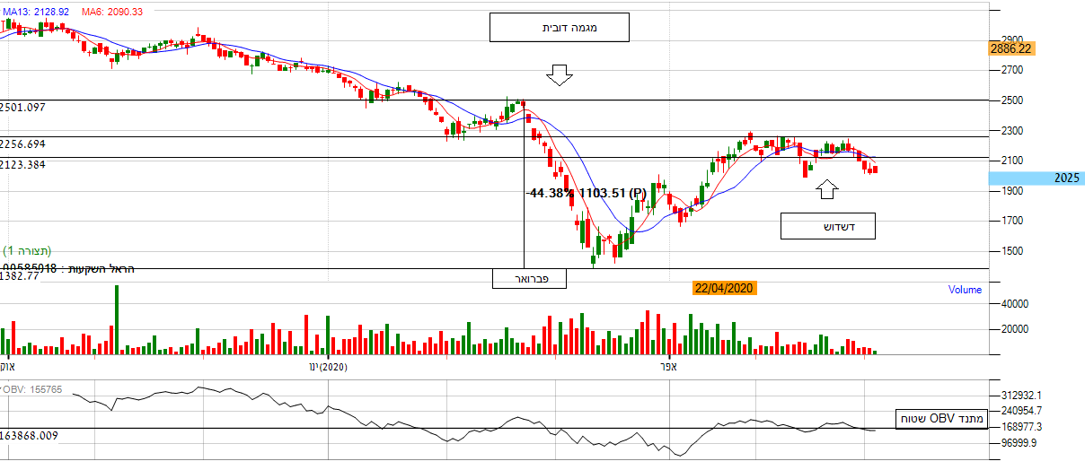 - המגמה הראשית בגרף דובית. המניה ביצעה ירידה קיצונית בחודש פברואר של כ- 45% לשער 1390. מה שמסמל על מניה שלילית. לאחר ניסיון עליה של המניה לאזור קו ההתנגדות המניה פתחה בדשדוש ארוך , מה שמסמל על חוסר עניין במניה. בנוסף אם נתבונן על הממוצעים הנעים אנו נראה שהינם מסמלים על חוסר כיוון ברור בכך שלא ניתן לראות את כיוון התנועה, מעלה או מטה. בנוסף לפרמטרים שליליים, מתנד ה OBV מראה גרף מניה שטוח לחלוטין , כאן ניתן לראות שוב את חוסר העיינות מצד הקונים. *אנו נחכה להתפתחות המניה לאחד הצדדים.