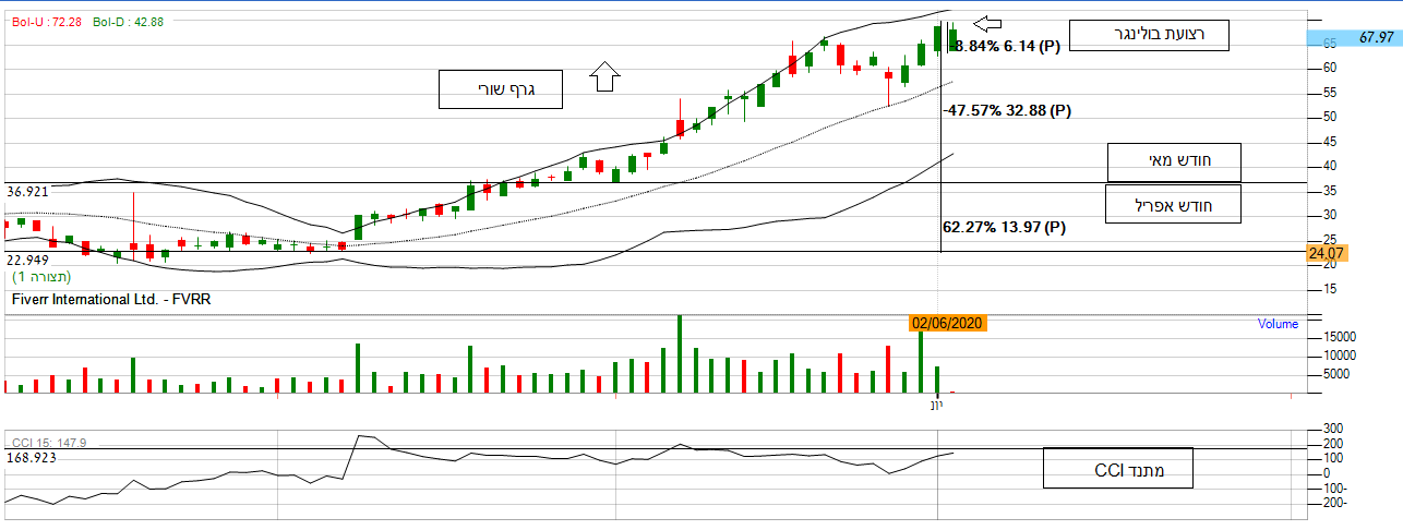 [2020-06-03 13:39:33] המנתחת: מנית פייבר (FVRR) - החברה דיווחה על גיוס של 100 מיליון דולר באמצעות הנפקת מניות שנייה בוול סטריט. אם נתבונן על הגרף החודשי לא ניתן להתעלם מהתשואה המטורפת של כ- 50% שהמניה עשתה בחודש מאי וכ- 60% בחודש אפריל. בניתוח שלי: המניה בגרף הראשי שורי. בטווח היומי המניה עלתה כ-9% מה שמסמל על עניין רב של קונים. אם נתבונן על מתנד ה- CCI אנו נראה שהינו מייצג הזדמנות כניסה למניה בכך שנע מעל ה -100 נקודות. בנוסף על פי רצועת בולינגר אנו נראה שהמניה מראה עוצמת קונים בכך המניה פורצת מעל הרצועה העליונה ואף ממשיכה עליה לכיוון הגבוה השנתי, מה שמסמל על מומנטום חיובי במניה. בנוסף לפרמטרים החיוביים, מחזורי המסחר מראים כמות קונים גדולה מכמות המוכרים, מה שמייצג על מניה חיובית. *אנו נכנס למניה.