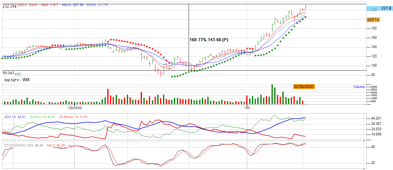 [2020-06-03 13:40:02] המנתחת: מנית וויקס (WIX) - המניה משלימה ראלי של יותר מ-160% בחודשיים. האם השינויים הנגרמים הם כתוצאה מתקופת נגיף הקורונה? על פי הניתוח שלי: המגמה הראשית בגרף שורית. ניתן לראות זאת על פי הממוצעים הנעים המסודרים בסדר עולה, מה שמייצג העיינות גבוה למניה. בנוסף על פי הגרף החודשי המניה ממשיכה להראות מניה חיובית בכך שמחזורי המסחר מראים כמות גדולה של קונים בכך שקיימות עמודות ירוקות ארוכות יותר מהעמודות האדומות. יתרה מכך, מתנד ה STOCK המהיר משדר איתות קניה בכך שהמניה ביצעה פעם אחת נגיעה באזור ה- 20 נקודות ומאז לא נגעה יותר. אם נתבונן על מתנד ה P.SAR אנו נראה שהינו מייצג מגמת עליה בכך שקיימות נקודות רבות מתחת לגרף המניה. בנוסף לפרמטרים החיוביים וכדי לחזק את הטענה, מתנד ה ADX מייצג איתות חיובי בכך שה DIP (הירוק) חוצה את DMI (האדום) כלפי מעלה. יתרה מכך, ה- DIP עולה מעל רף ה- 25 , מה שמסמל על מגמה שורית חזקה מאוד.