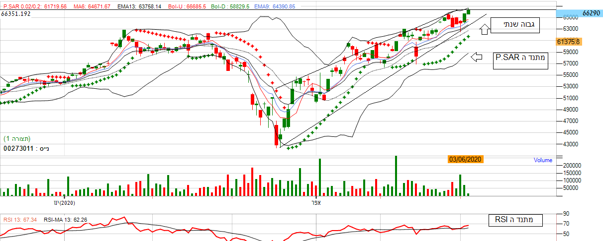 - בניתוח האחרון הערכתי שהמניה הייתה במגמה שורית. כעת ניתן לראות שהינה המשיכה את תנועתה אל הגבוה השנתי שהינו 66430, מה שמייצג העיינות גבוהה למניה. בנוסף אם נתבונן על הגרף השנתי אנו נראה שהמניה הצליחה לפרוץ את רמת ההתנגדות מה שמסמל על המשך עליות בטווח המיידי. יתרה מכך המניה נעה בתוך רצועת הבולינגר בין הרצועה האמצעית לעליונה , מה שמסמל על מומנטום חיובי. אם נתבונן על מתנד ה P.SAR אנו נראה שקיימות נקודות ירוקות רבות מתחת לגרף המניה, מה שמייצג מגמת עליה. בנוסף לפרמטרים החיוביים, מתנד ה RSI מייצג מהלך עליות כאשר המניה נעה בין 50- 70 נקודות . *אנו נכנס למניה.