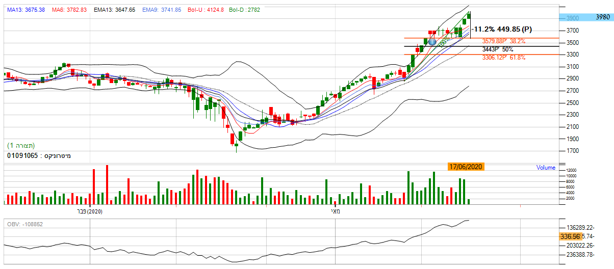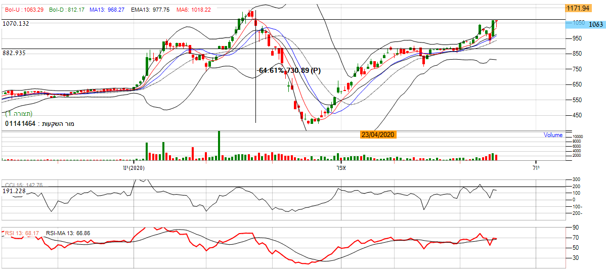 [2020-06-17 14:00:06] המנתחת: מנית מור השקעות - לאחר תקופת דשדוש המניה סביב השער 876 בחודש מאי, המניה משנה את תנועתה לשורית ועושה מהלך ניסיון עליה לאזור הגבוה השנתי שהינו 1130. על פי רצועת הבולינגר אנו נראה שהמניה מייצגת היענות גבוהה למניה בכך שהינה נעה באזור הרצועה העליונה ואף פורצת אותה, מה שמסמל על המשך מגמה חיובית בטווח המיידי. בנוסף המומנטום בגרף החודשי עדיין חיובי כאשר הממוצעים הנעים מסודרים בסדר עולה. יתרה מכך, מתנד ה RSI מסמל על כמות קונים גדולה בכך שנע באזור ה50 - 70 נקודות. בנוסף לפרמטרים החיוביים , מתנד ה CCI נע לכיוון ה- 200 נקודות מה שמייצג מגמת עלייה. *אנו נכנס למניה.