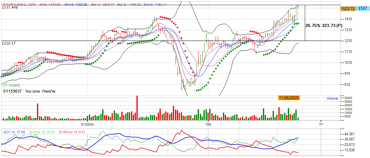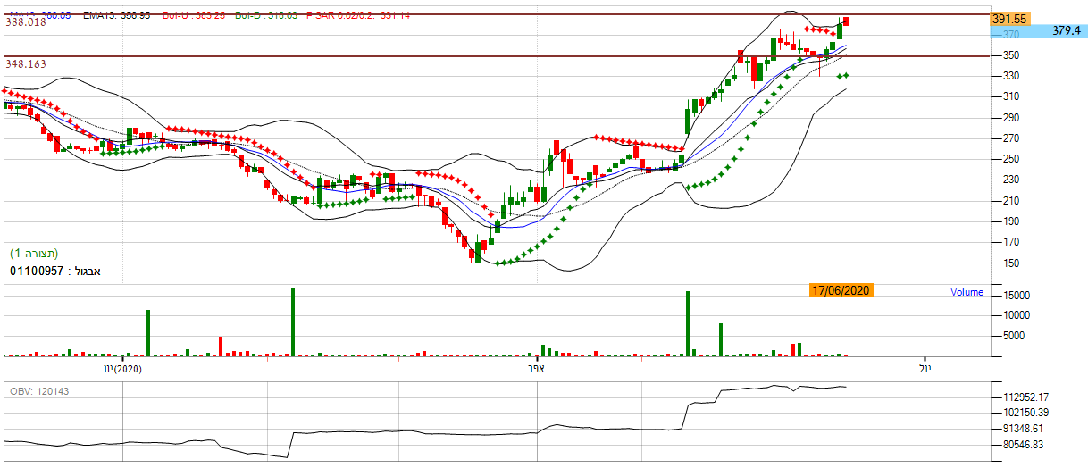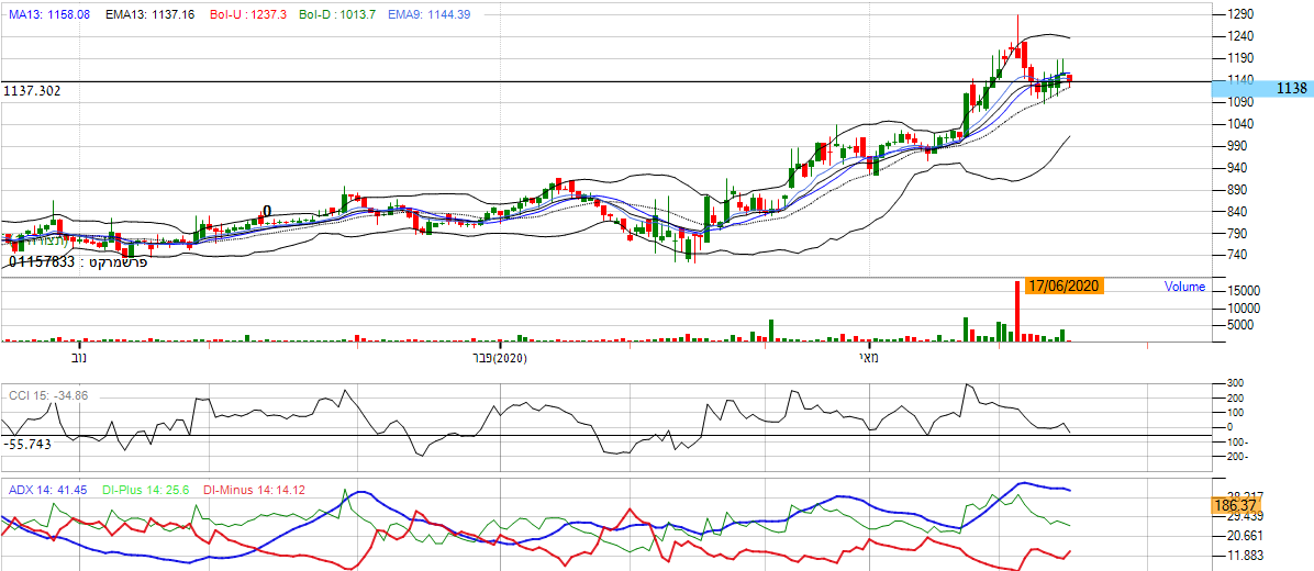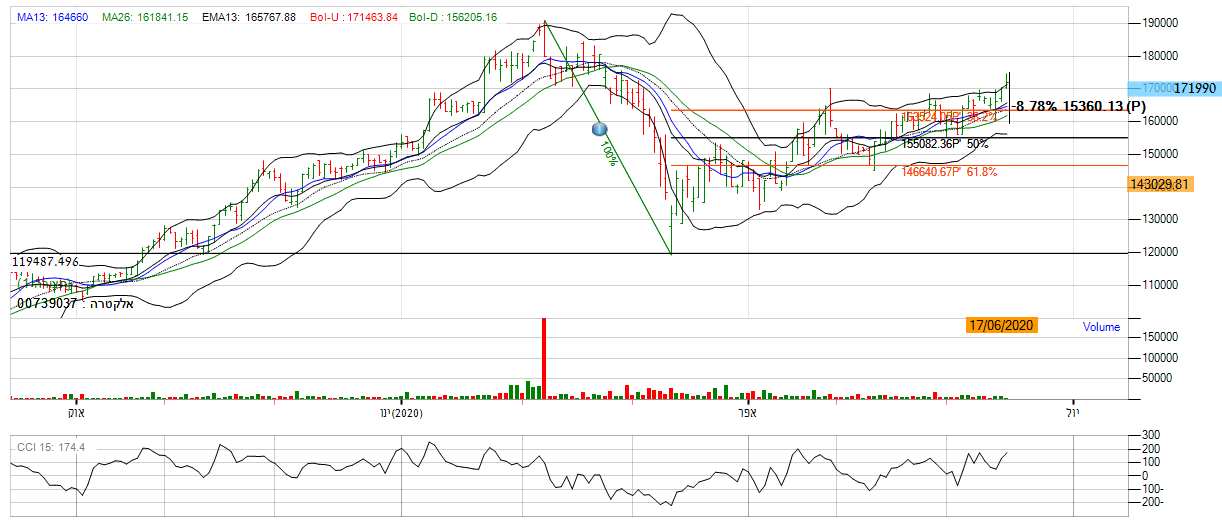 [2020-06-17 14:37:55] המנתחת: אם נתבונן על הגרף היום אני נראה שהמגמה חזרה לאותו הכיוון, המניה נעה באזור השער 14900 , מה שמסמל על המשך חוסר העיינות במניה. ניתן לראות זאת על פי רצועת הבולינגר, המניה אומנם נעה מעל לגבול העליון אך עדיין לא פורצת ממנה, מה שמייצג מומנטום שלילי. יתרה על כך, מתנד ה ADX מראה גם כאן חוסר כיוון בכך שהקו האדום והקו הירוק נעים באותו הכיוון. *אנו לא נכנס למניה.