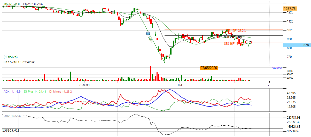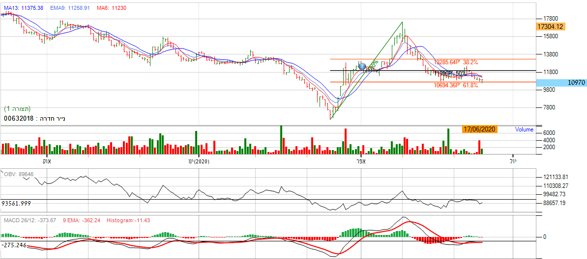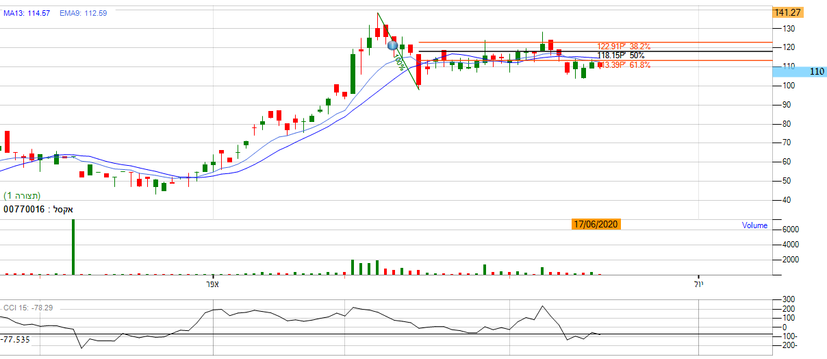 [2020-06-17 14:47:28] המנתחת: לאחר שהמניה ביצעה עליה לאזור הגבוהה השנתי שהינו 135 זו שינתה את כיוונה ופתחה בדשדוש מובהק בכך שנעה באזור השער 112, מה שמייצג מומנטום שלילי. בנוסף על פי חיתוכי הפיבונאצי , אנו נראה שהמניה נעה בין הגבול האמצעי לתחתון, מה שמסמל על חוסר העיינות במניה. בנוסף לפרמטרים השליליים, אנו נסתכל על מתנד ה- CCI שהינו נע מתחת ל-0 נקודות ובדשדוש מוחלט. *אנו לא נכנס למניה ונמתין להתפתחות המניה לאחד הכיוונים.