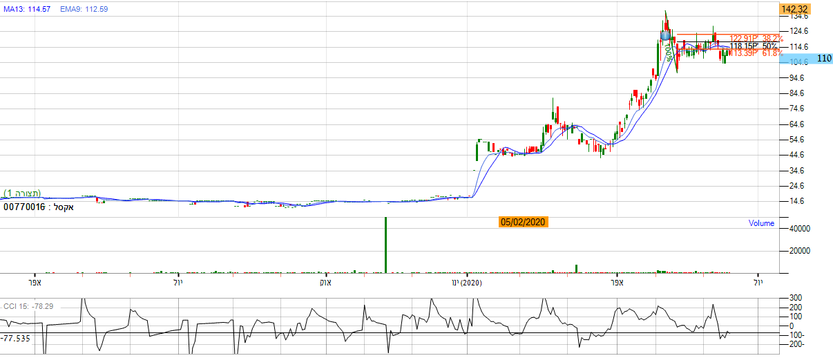 - המניה מראה מגמה חיובית בטווח היומי, לאחר דשדוש ממושך באזור השער 155,000. אם נתבונן על הגרף החודשי אנו נראה שהמגמה בטווח היומי עדיין חיובית כאשר הממוצעים הנעים מסודרים בסדר עולה, מה שמסמל על עוצמה והמשך מומנטום חיובי בטווח המיידי. בנוסף על פי חיתוכי פיבונאצ'י ניתן לראות שהמניה ממשיכה להיות חיובית כאשר המניה פרצה את הגבול העליון ועלתה בטווח היומי כ-8% ב-3 ימים, מה שמייצג עוצמת קונים גדולה. בנוסף לפרמטרים החיוביים אם נתבונן על מתנד ה CCI אנו נראה שהינו נע באזור ה- 100- 200 נקודות , מה שמייצג הזדמנות כניסה למניה. *יתכן תיקון טכני קטן של 5% אך זו הזדמנות קניה.