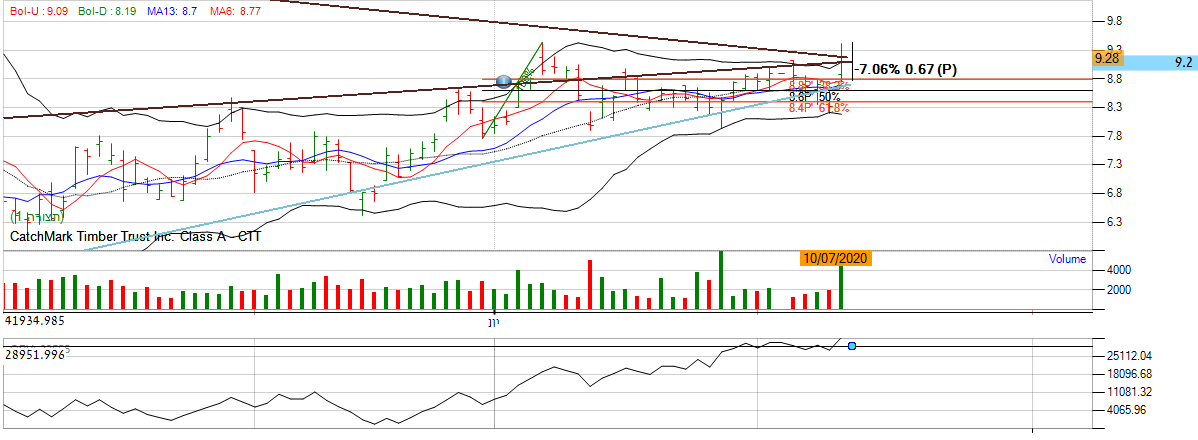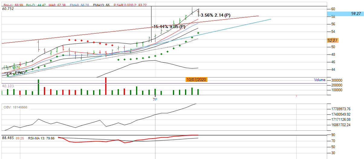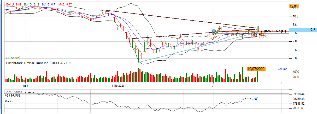 [2020-07-13 13:28:30] המנתחת: בטווח הארוך: המגמה בגרף הראשי שורית. על פי גרף העמודות המניה עלתה קרוב ל 15% בשבוע , מה שמייצג העיינות גדולה למניה. המומנטום בגרף החודשי עדיין חיובי כאשר הממוצעים הנעים מסודרים בסדר עולה. בנוסף לפרמטים החיוביים המניה פרצה את הרצועה העליונה של רצועת בולינגר ואף בטווח היומי עלתה לגבוהה השנתי שהינו 60 , מה שמייצג המון קונים במניה. בנוסף לפרמטרים החיוביים אם נתבונן על מתנד ה OBV אנו נראה שכיוון המגמה עדיין חיובי בכך שהגרף נע במגמה שורית.