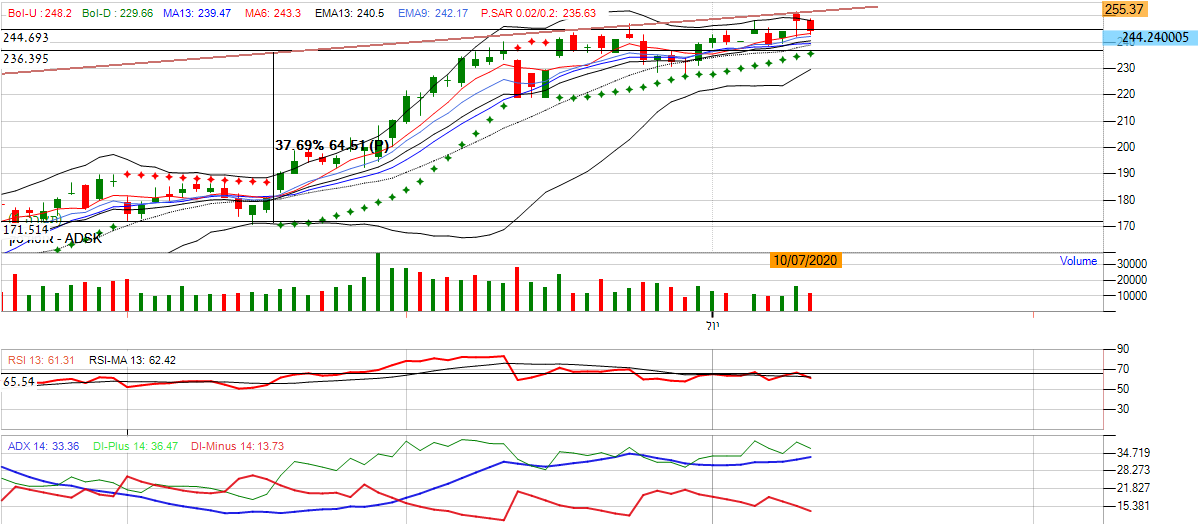 [2020-07-13 13:30:36] המנתחת: בטווח הקצר: אם נתבונן על הגרף החודשי אנו נראה שהמניה מצייגת דשדוש קלאסי בכך שנעה באזור השער 240, מה שמסמל על היחלשות הנייר. בנוסף, אם נתבונן על מתנד ה- ADX אנו נראה שהינו מייצג חוסר כיוון במניה בכך שהקו האדום והקו הירוק נעים באותו הכיוון. *אנו נמתין להתפתחות המניה לאחד הצדדים.