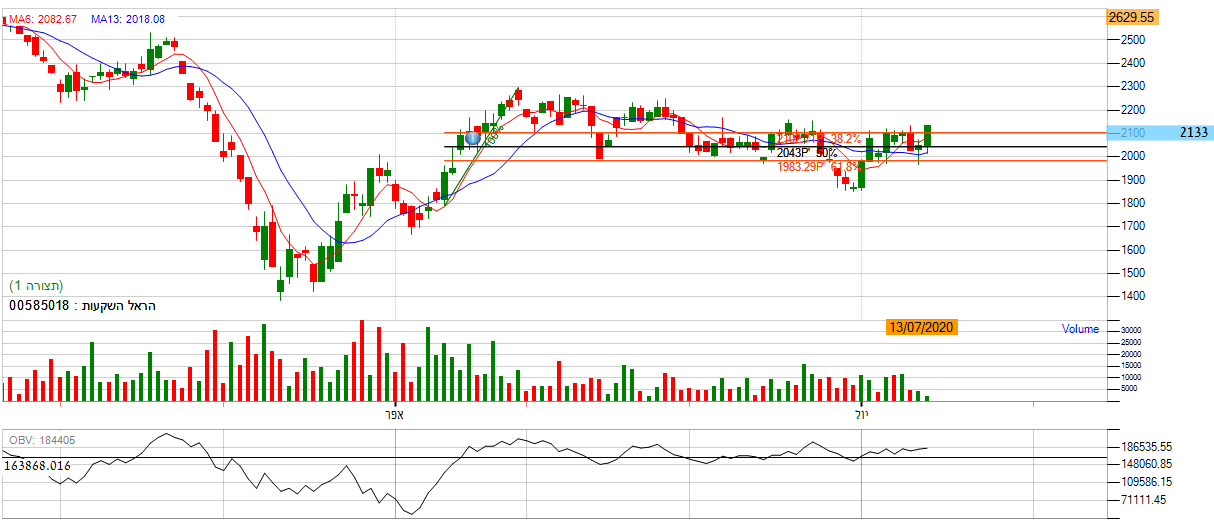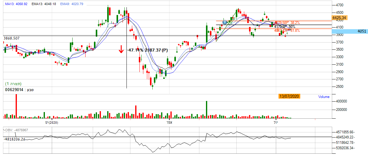 [2020-07-13 14:01:57] המנתחת: כעת בניתוח היום, על פי חיתוכי פיבונאצי אנו נראה שהמניה מראה את תנועתה בין הגבול העליון לתחתון, מה שמסמל על דשדוש מובהק. בנוסף , אם נתבונן על הממוצעים הנעים אנו נראה שהינם מייצגים היחלשות הנייר בכך שנעות באזור השער 4200, מה שמייצג דשדוש בטווח המיידי. יתרה מזה, מתנד ה- OBV שטוח לחלוטין, מה שאומר שגם הוא מייצג חוסר כיוון במניה. *אנו נחכה להתפתחות המניה לאחד הצדדים וננתח שוב.
