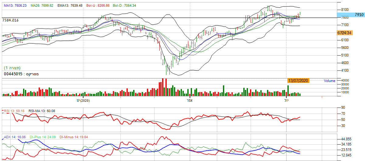 [2020-07-13 14:12:51] המנתחת: בטווח הקצר: אם נתבונן על הגרף החודשי אנו נראה שהמניה מייצגת דשדוש מובהק. ניתן לראות זאת על פי הממוצעים הנעים, הנעים באזור השער 7600 , מה שמייצג היחלשות הנייר. בנוסף , מתנד ה ADX מראה מוסר כיוון ברור בכך שהקו הירוק והקו האדום נעים באותו הכיוון. *אנו נחכה להתפתחות המניה לאחד הכיוונים וננתח מחדש.