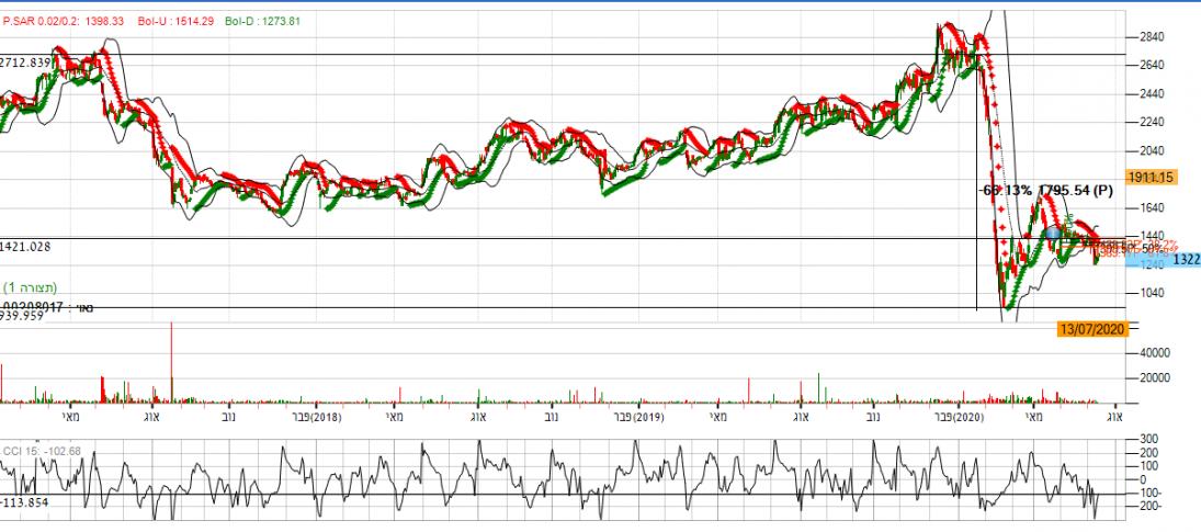 [2020-07-13 14:36:15] המנתחת: בניתוח הגרף החודשי אנו נראה שהמניה נכנסה לתקופת דשדוש באזור השער 1400. ניתן לראות זאת על פי חיתוכי פיבונאצ'י, המניה נעה בין הגבול העליון לתחתון ואף יורד מתחתיה, מה שמסמל על שליליות. בנוסף, על פי מתנד ה- CCI אנו נראה שהינו נע באזור ה- 100- ל 200- נקודות שאלו