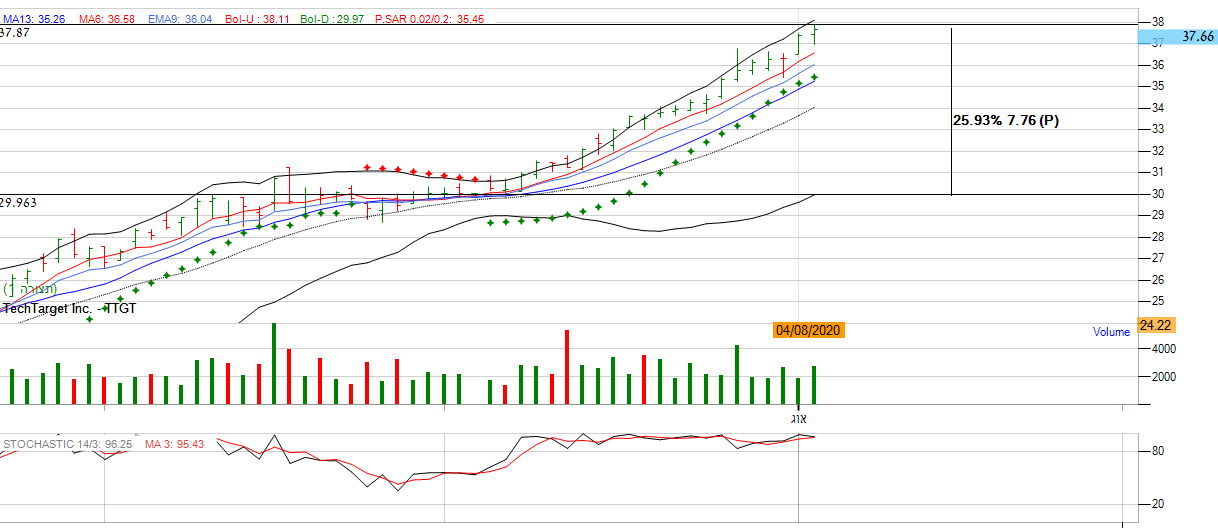 [2020-08-05 13:29:50] המנתחת: מנית TTGT - בניתוח גרף העמודות ניתן לראות שבמהלך חודש יוני המניה פתחה בדשדוש סביב השער 30 אך זו ביצעה שינוי מגמה בכך שעלתה כ- 25% בחודש יולי מה שמסמל על העינות גבוהה למניה. אם נתבונן על הגרף החודשי אנו נראה שהמניה נעה בין הרצועה האמצעית לעליונה של רצועת בולינגר ואף פורצת ממנה, מה שמסמל על מניה חיובית. בנוסף על פי מחזורי המסחר אנו נראה שכמות הקונים גוברת על כמות המוכרים בכך שקיימות עמודות ירוקות רבות יותר מכמות העמודות האדומות המסמלות על מגמה חיובית. בנוסף לפרמטרים החיוביים גרף המניה עלה לאזור הרצועה העליונה של רצועת בולינגר ואף בטווח היומי עלה לגבוה השנתי שהינו 37, מה שמייצג המון קונים במניה. המומנטום בגרף החודשי עדיין חיובי כאשר הממוצעים הנעים מסודרים בסדר עולה. יתרה מכך מתנד ה P.SAR ממשיך להראות מגמה עולה בכך שקיימות נקודות ירוקות רבות מתחת לגרף המניה. כדי לחזק את הטענה אנו נתבונן על מתנד ה STOC מהיר שנע מעל ל 80 נקודות , מה שמייצג רמת שיא של מניה = המון קונים. * המניה מעולה לכניסה גם לטווח ארוך וגם לטווח קצר . בטווח הקצר למימוש עד 10%