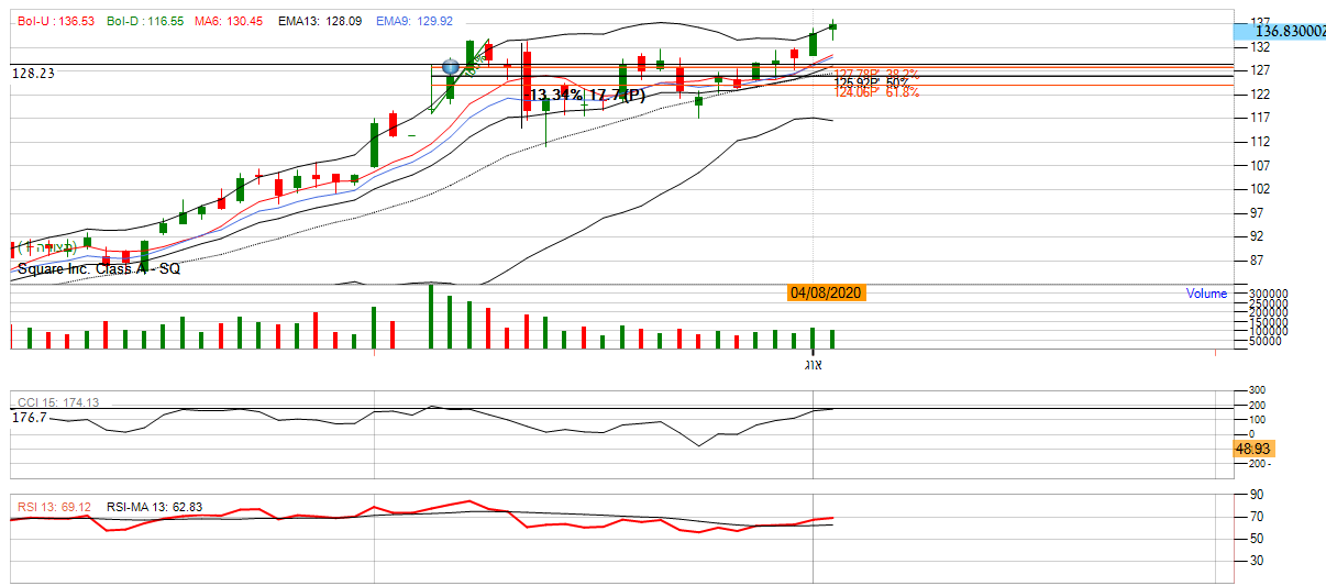 [2020-08-05 13:30:58] המנתחת: מנית SQ - בטווח הארוך: המגמה הראשית בגרף שורית. על פי הגרף החודשי אנו נראה שהמגמה בטווח היומי עדיין חיובית כאשר הממוצעים הנעים מסודרים בסדר עולה, מה שמסמל על עוצמה והמשך מומנטום חיובי בטווח המיידי. על פי רצועת בולינגר ניתן לראות שהמניה ממשיכה להיות חיובית כאשר היא נעה בין הרצועה האמצעית לעליונה ואף פורצת ממנה לאזור הגבוה השנתי שהינו 136 , מה שמייצג עוצמת קונים גדולה. בנוסף לפרמטרים החיוביים, מתנד ה- RSI מייצג איתות קניה בכך שנעה באזור ה 50 - 70 נקודות. *המניה מייצגת איתות קניה