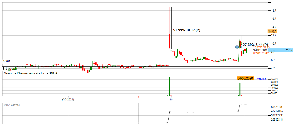 [2020-08-05 13:53:48] המנתחת: מנית SNOA - אחת המניות הגרועות לניתוח. על פי הגרף השנתי אנו נראה שהמניה הראתה שהייה ממושכת באזור השער 5.1 מתחילת חודש ינואר עד סוף חודש מאי, מה שייצג דשדוש מובהק. לאחר שהייה זו אנו נראה מהלך של שורט סקוויז - מכירה בשער גבוה (לחץ פסיכולוגי בקרב שורטיסטים הגורם לזינוק