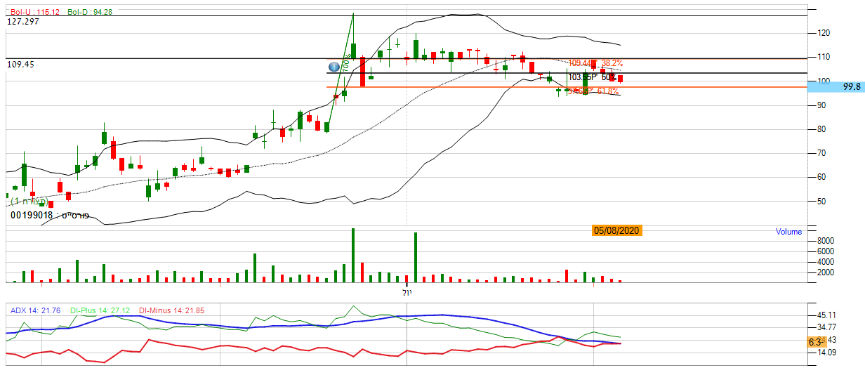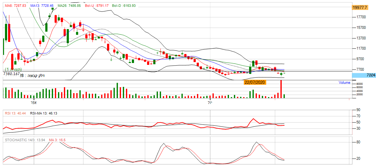 [2020-08-05 13:32:01] המנתחת: בטווח הקצר: גם כאן גרף המניה בטווח היומי עלה מעל לרצועה העליונה , מה שאומר שקיים סיכוי לתיקון שלילי כלפי מטה. בנוסף אם נתבונן על מתנד ה- CCI אנו נראה שהינו נע באזור ה- 200 נקודות שזהו אזור קיצוני ואנו לא נרצה להיות שם. *אנו לא נכנס למניה
