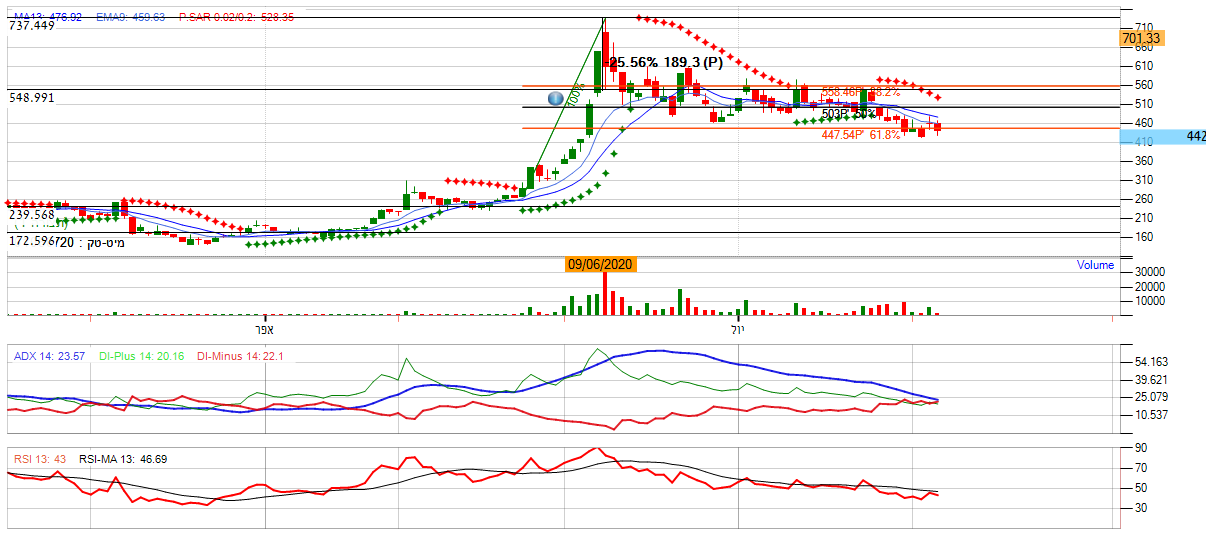 [2020-08-05 14:20:30] המנתחת: בטווח הארוך: המגמה הראשית בגרף שורית. בטווח היומי המניה עלתה קרוב ל 25% ב- 5 בימים בלבד , מה שמייצג מניה חיובית. על פי מתנד ה- RSI אנו נראה שהינו נע באזור ה 50 -70 נקודות , מה שמסמל על המשך מגמה חיובית בטווח המיידי. בנוסף לפרמטרים החיוביים, מתנד ה- ADX מראה איתות חיובי בכך ש הקו הירוק חוצה את הקו האדום כלפי מעלה. *אנו נכנס למניה.