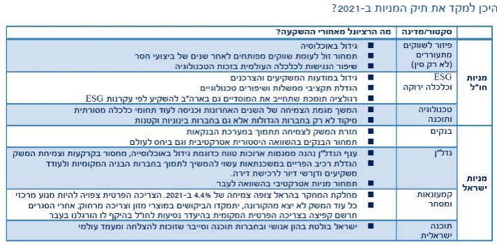 בעיני המשקיעים האטרקטיביות של השוק המקומי הינה גבוהה היות ובעוד כחודשיים אנחנו כנראה נהיה המדינה הראשונה שתהיה לאחר סגר שלישי ואחרי שחלק גדול מהאוכלוסייה כבר התחסנה. בשילוב עם ריבית אפסית וביצועי החסר של השוק המקומי, נראה כי 2021 תיפתח בצורה טובה למשקיע הישראלי. להערכתנו, סיכוי גבוה לכך שב-2021, התשואה של מניות בישראל תהיה גבוהה משל מדד ה-S&P500.